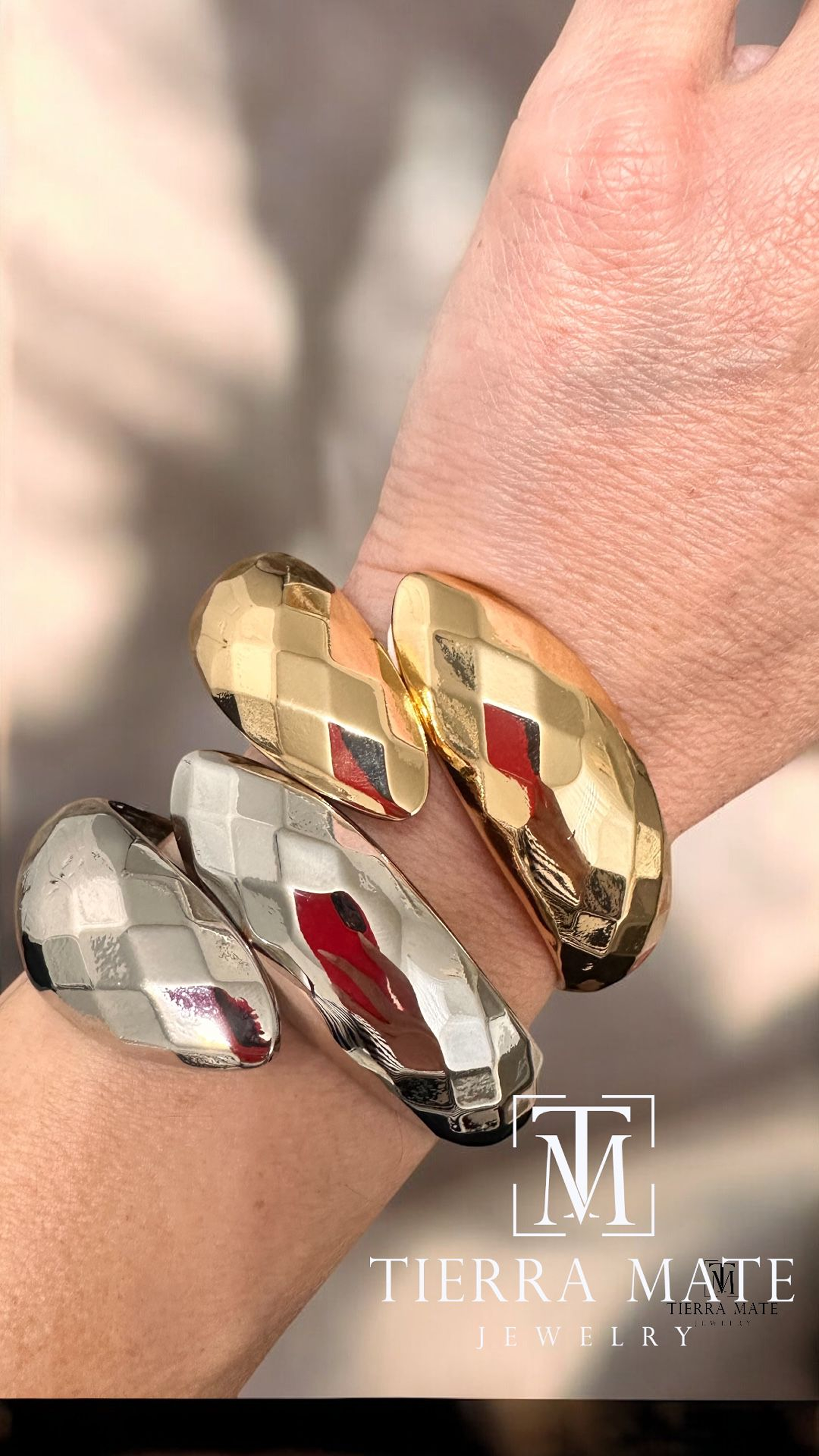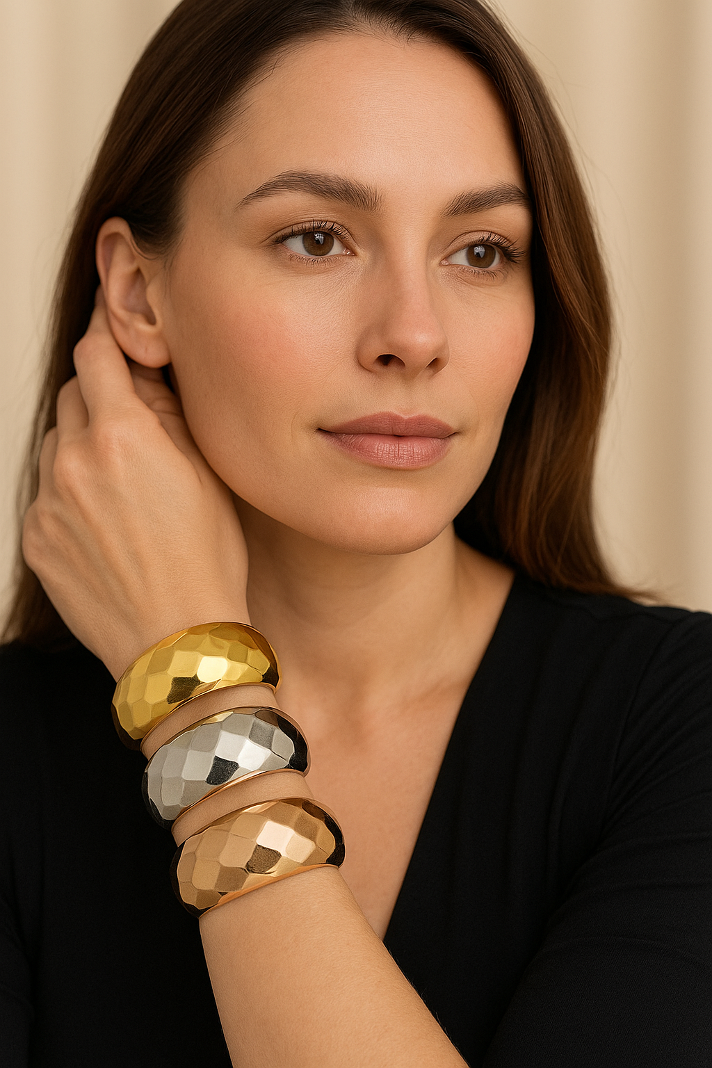 Estas pulseras tipo brazalete con acabado facetado están disponibles en dorado, plateado y rosé, combinando brillo intenso con diseño moderno. Una declaración de estilo audaz para quienes aman destacar com clase.